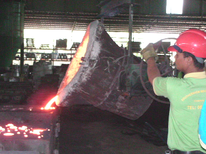 Melting and pouring of molten iron under controlled temperature conditions.